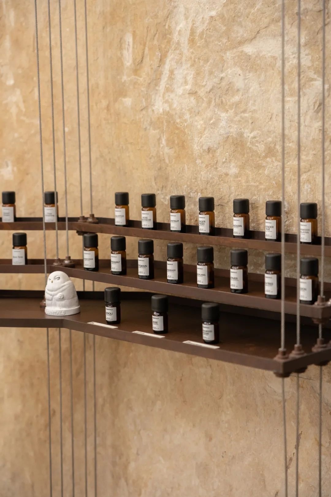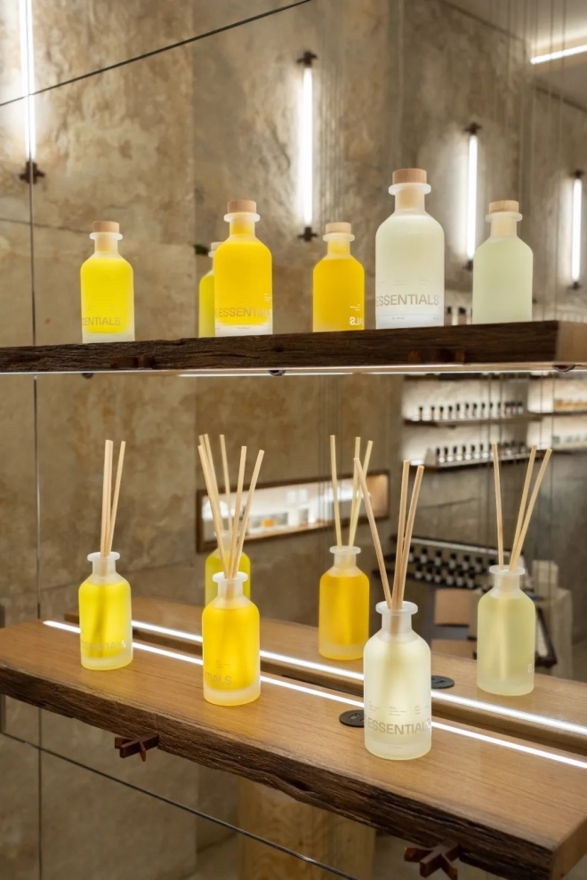 首店內(nèi)部以大理石和木板為主要元素,以乳白色和咖色為主色調(diào),正如主打產(chǎn)品精油般給人一種溫馨舒適的感覺。有意思的是,門店入口處擺放著一套化學(xué)器材裝置,為整個門店增添了趣味。