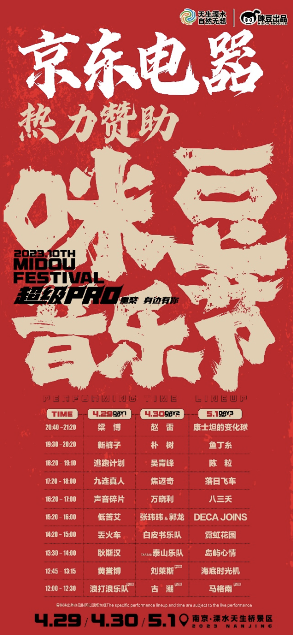 憑借厚重的文化底蘊(yùn)和豐富的人間至味,南京2023年以網(wǎng)紅城市火爆出圈,預(yù)計(jì)五一假期游客數(shù)將再創(chuàng)新高。4月29日至5月1日,京東五星電器熱力贊助的2023第十屆咪豆音樂節(jié)超級(jí)Pro將在南京溧水天生橋景區(qū)舉行,陣容強(qiáng)大,吸引全國樂迷齊聚南京。