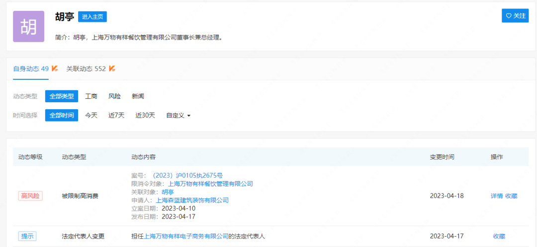 企查查信息顯示,4月18日,上海萬物有樣食品有限公司母公司——上海萬物有樣餐飲管理有限公司(以下簡稱“上海萬物有樣”)因有履行能力而拒不履行生效法律文書確定義務,被列入失信被執(zhí)行人名單,上海萬物有樣和胡亭均被限制高消費。