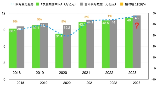 2022年底2023年初的疫情最后一波的沖擊雖然非常迅猛,但是由于已經(jīng)解除了封控措施,所以對(duì)經(jīng)濟(jì)影響不大。如果用2023年一季度的11.5萬(wàn)億的數(shù)據(jù)乘以4,則2023年全年的社零總額即使在沒(méi)有任何正向溢出的情況下(即全年的實(shí)際數(shù)據(jù)正好等于一季度乘以4),也可達(dá)到46萬(wàn)億元。而46萬(wàn)億元相較于2022年的44萬(wàn)億元正好增長(zhǎng)5%。即消費(fèi)這塊將圓滿實(shí)現(xiàn)今年三月人大提出的GDP 5%的增長(zhǎng)目標(biāo)?紤]到在如此困難的2022年我們還有1%的正向溢出,所以,對(duì)于2023年最終實(shí)現(xiàn)社零總額46萬(wàn)億元幾乎就是可以確定的事情。加上報(bào)復(fù)性反彈和疫情影響的消除等因素,我們甚至還可以期待社零總額上看48萬(wàn)億元。其實(shí)只要補(bǔ)回2022年潛在的4%的損失就可以實(shí)現(xiàn)這個(gè)目標(biāo)。但是,我們也許還沒(méi)有到可以如此樂(lè)觀的程度,所以這也是筆者為什么在圖2的48萬(wàn)億下寫(xiě)下一個(gè)問(wèn)號(hào)的原因。