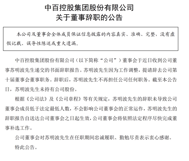 公告宣布,中百集團(tuán)董事會于近日收到公司董事蘇明波遞交的書面辭職報告。蘇明波因為工作調(diào)整,提請辭去中百集團(tuán)第十屆董事會董事職務(wù)。辭職后,蘇明波不再擔(dān)任中百集團(tuán)任何職務(wù)。截至本公告日,蘇明波未持有中百集團(tuán)股份。