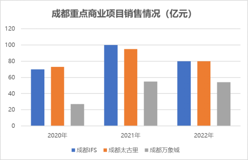 以2022年的銷售數(shù)據(jù)來看,成都IFS、成都太古里及成都萬象城分別實現(xiàn)80億元、80億元及54億元銷售額。