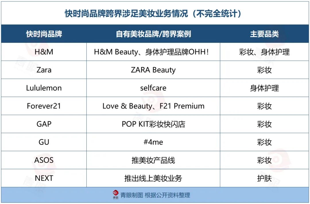 近年來(lái)隨著美妝市場(chǎng)的火熱,快時(shí)尚品牌跨界做美妝已經(jīng)成為一種風(fēng)潮,除H&M外,Zara、Forever21、Lululemon、森馬等國(guó)內(nèi)外快時(shí)尚品牌都先后涉足美妝領(lǐng)域。