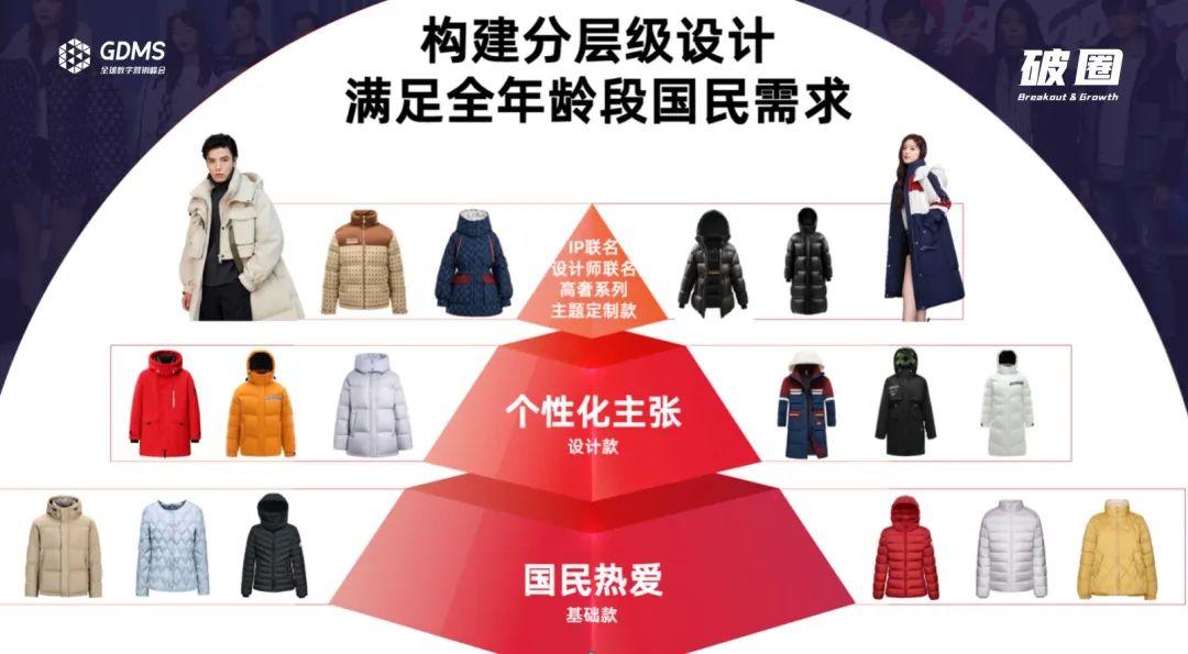 二是解決國民需求。除創(chuàng)新外,還可成為“貨架品牌”。即基礎款、個性款的羽絨服,甚至冬季的衣物都能在這里找到。這需要具備極多的SKU,較低價的價格,才有可能涵蓋男女老少。