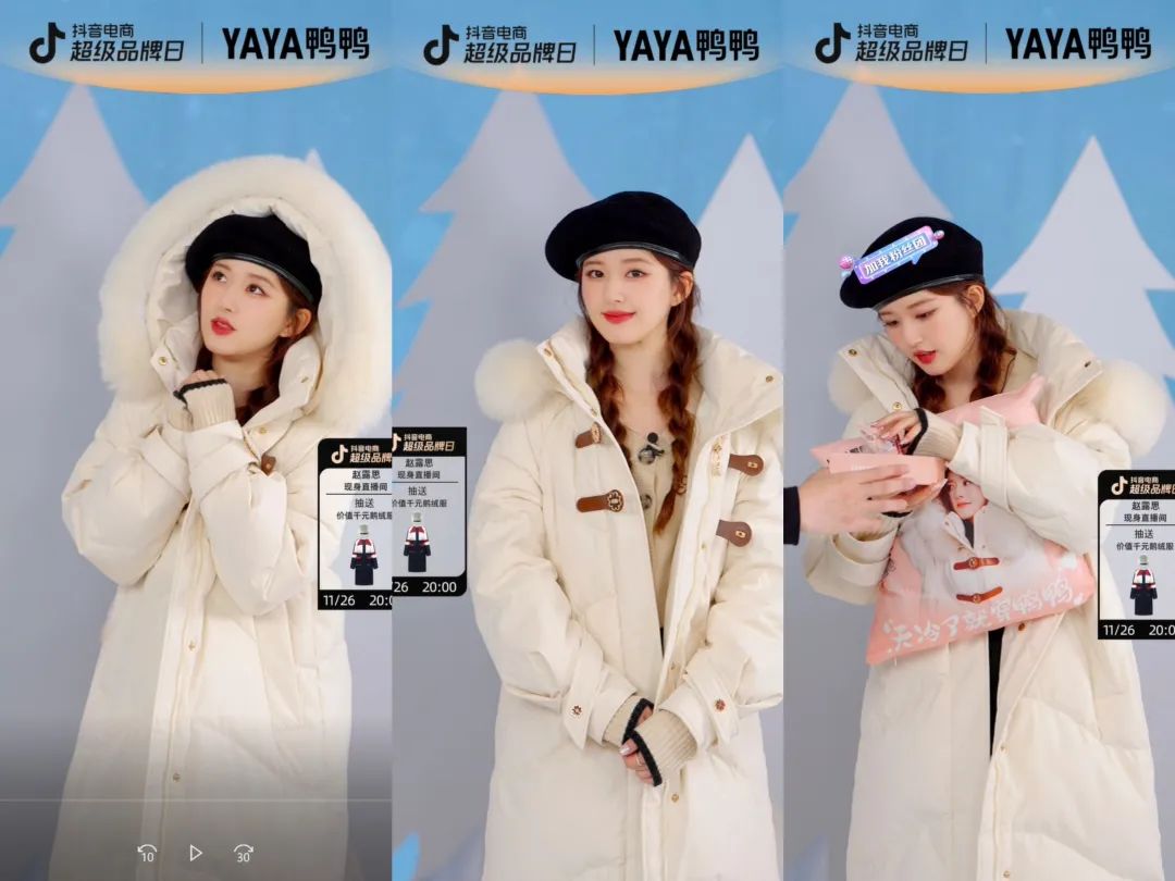去年,鴨鴨推出與海外獨立設計的聯名系列,其中趙露思同款“大毛領”,單平臺GMV突破2億元,其中有一場直播單件創(chuàng)造了5000萬銷售額,這也是抖音品牌自播單場的紀錄。