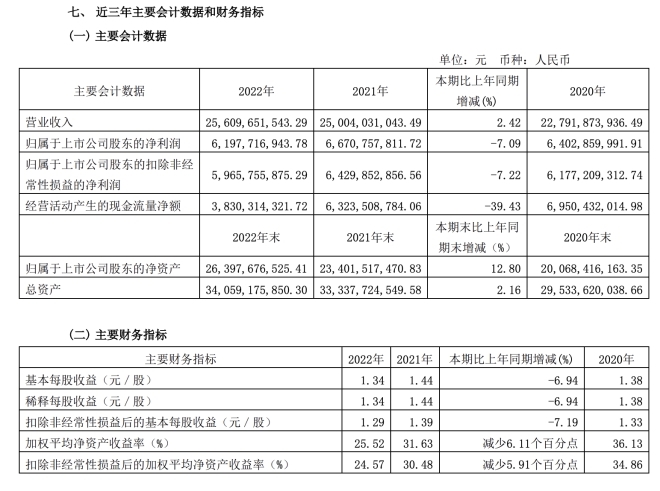 2022年,海天味業(yè)實現(xiàn)營收256.10億元,同比增長2.42%;歸屬于上市公司股東的凈利潤61.98億元,同比下降7.09%,這也是海天味業(yè)上市以來首次出現(xiàn)凈利同比下降;經(jīng)營活動產(chǎn)生的現(xiàn)金流凈額38.30億元,同比下降39.43%;基本每股收益1.34元,同比下降6.94%;海天研發(fā)投入總額7.51億元,占全年營業(yè)收入2.93%。