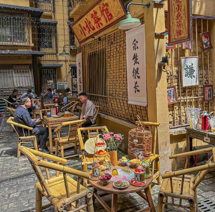 像吼堂會(huì)有非遺文化“鳴堂技藝”的吆喝聲,“貴客到,里面請(qǐng)”,讓顧客有儀式感,還有一個(gè)”黃金三分鐘“的服務(wù)點(diǎn),即迎賓在帶著客人餐位就座后,不會(huì)立刻離開(kāi),而是倒茶水、提供圍裙、手機(jī)套、皮筋等。