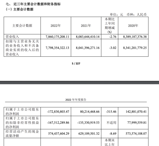2022年,利群股份實現(xiàn)營收78.60億元,同比下降3.02%;歸屬于上市公司股東的凈利潤-1.73億元,同比下降315.46%,出現(xiàn)了上市以來首次年度虧損;經(jīng)營活動產(chǎn)生的現(xiàn)金流量凈額5.74億元,同比下降8.69%;基本每股收益-0.2元,2021年同期為0.11元。