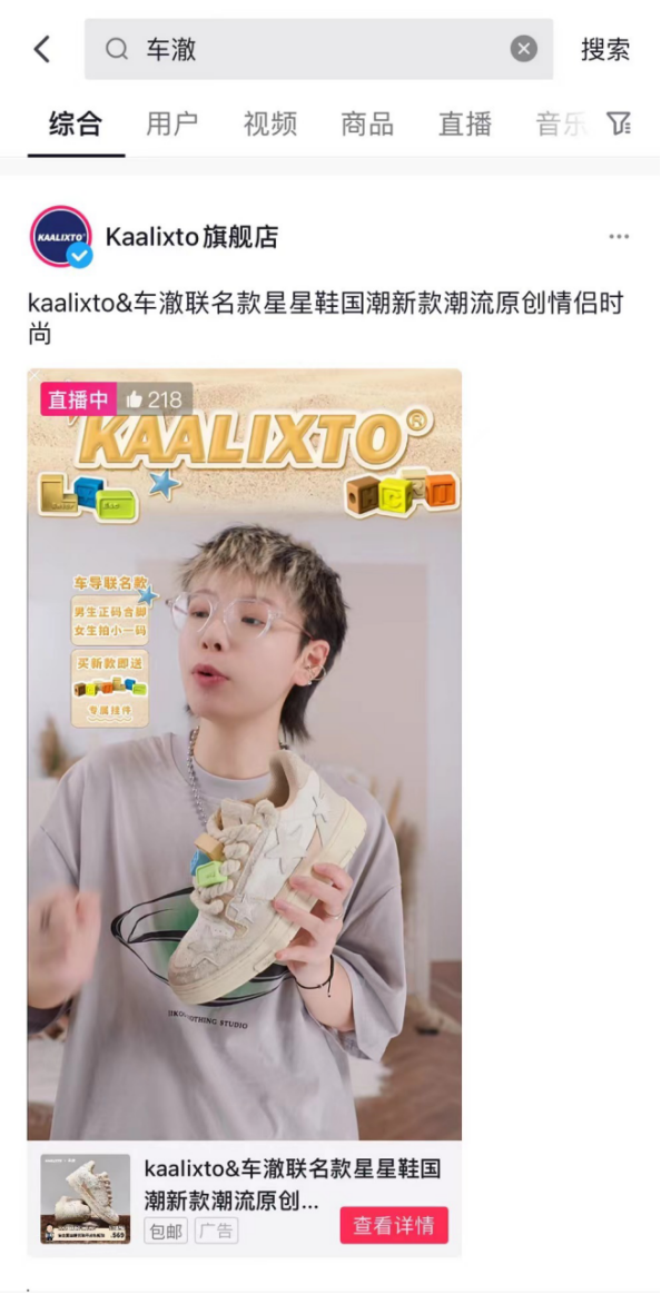 抖音的搜索與傳統(tǒng)電商的搜索的人找貨邏輯不同,是啟發(fā)式搜索,內(nèi)容更加豐富化、場(chǎng)景化導(dǎo)向。以被車澈賣爆的品牌Kaalixto為例,直播間的標(biāo)題帶上“車澈星星鞋”這一關(guān)鍵詞,在消費(fèi)者搜索車澈時(shí),第一個(gè)是車澈的抖音賬號(hào),第二個(gè)就是這一品牌直播間。
