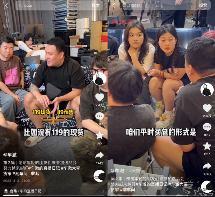 在過(guò)往綜藝經(jīng)驗(yàn)的支撐下,連直播復(fù)盤都被車澈做成短綜,邀請(qǐng)了部分帶貨首秀的消費(fèi)者到現(xiàn)場(chǎng)選品提建議,討論的問(wèn)題也很實(shí)在,比如“你們對(duì)于預(yù)售怎么看?如果119元的現(xiàn)貨和89元的預(yù)售十五天怎么選?”“國(guó)潮賽道比較經(jīng)典的logoT你們會(huì)買嗎?”“你們平時(shí)買潮流包的心智是好看還是實(shí)用?”