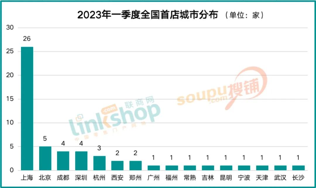 從城市分布來看,上海穩(wěn)定發(fā)揮,以26家首店拔得頭籌,一季度新開首店占比接近一半;北京位列第二,一季度共開出5家全國首店,成都、深圳以4家全國首店的成績并列第三,之后是3家首店的杭州,2家首店的西安和鄭州。