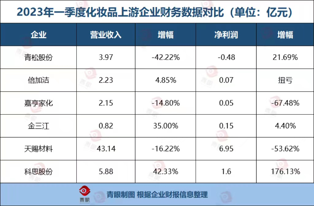 青眼梳理已公布2023年一季度財(cái)報(bào)的企業(yè)財(cái)務(wù)數(shù)據(jù)發(fā)現(xiàn),一季度的全面式、爆發(fā)式增長(zhǎng)并未如期到來(lái)。在統(tǒng)計(jì)范圍內(nèi)的6家企業(yè)中,青松股份(主要系原子公司出表所致)、嘉亨家化、天賜材料均出現(xiàn)了營(yíng)業(yè)收入、凈利潤(rùn)的下滑。