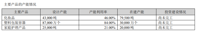 據(jù)嘉亨家化年報(bào)數(shù)據(jù)顯示,截至2022年,嘉亨家化化妝品、塑料包裝容器、家庭護(hù)理產(chǎn)品產(chǎn)能利用率分別為46%、84%和21%。
