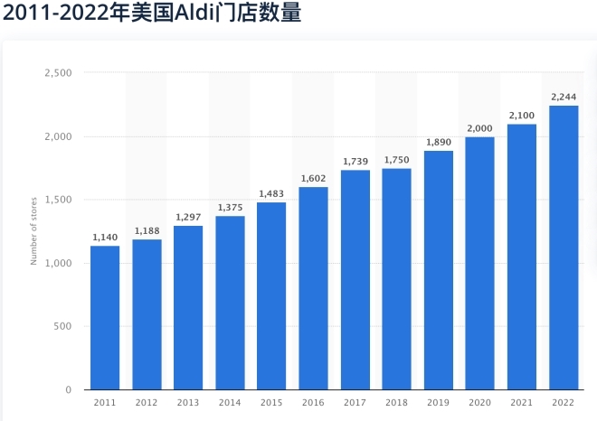 截至目前,ALDI官方公布美國門店數(shù)量達2297。圖源:Statista