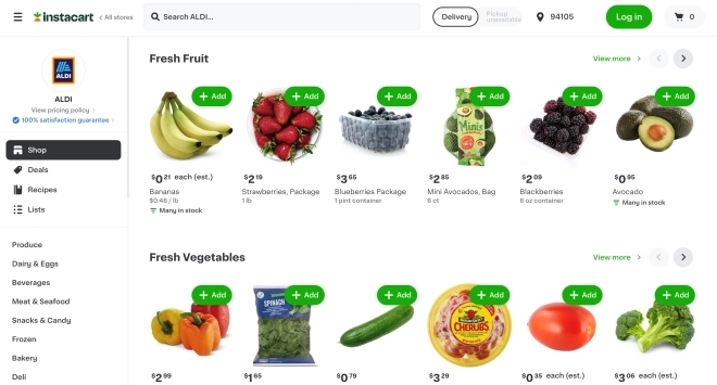 ALDI與全美最大的生鮮配送企業(yè)Instacart合作,在其線上平臺上線店內(nèi)同款同價格產(chǎn)品。圖源:Instacart官網(wǎng)