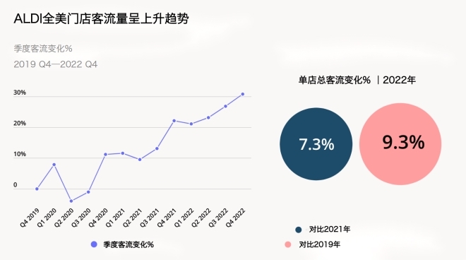 這一增長奇跡與其狂熱的客戶群體可謂無不相關(guān)。據(jù)人工智能企業(yè)Placer.ai的一份新報告披露,ALDI在2022年第四季度的客流量增速為最大。具體而言,這家商超的店鋪客流量同比增長了6.8%,較三年前增長了30.2%,很大程度上歸功于該品牌在美國的持續(xù)擴張。