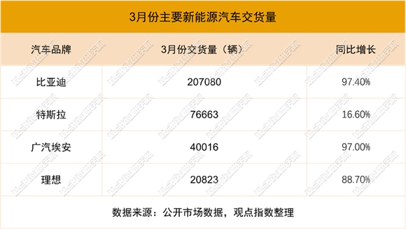 3、4月份我國(guó)新能源汽車(chē)銷(xiāo)量持續(xù)火爆,比亞迪僅3月的銷(xiāo)量就達(dá)20.17萬(wàn)輛,同比增長(zhǎng)97.4%,穩(wěn)居國(guó)內(nèi)交付量第一。而3月份特斯拉在中國(guó)的銷(xiāo)量為7.66萬(wàn)輛,同比增長(zhǎng)16.6%。另外,廣汽埃安3月交付量為4萬(wàn)輛,同比增速97%。理想3月份的交付量為2.08萬(wàn)輛,同比增長(zhǎng)88.7%。
