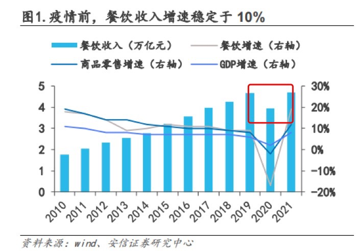 2015年-2019年期間,餐飲消費(fèi)增速高于當(dāng)時(shí)的GDP,受疫情影響驟然下降后,到了2021年很快回升到18.6%。