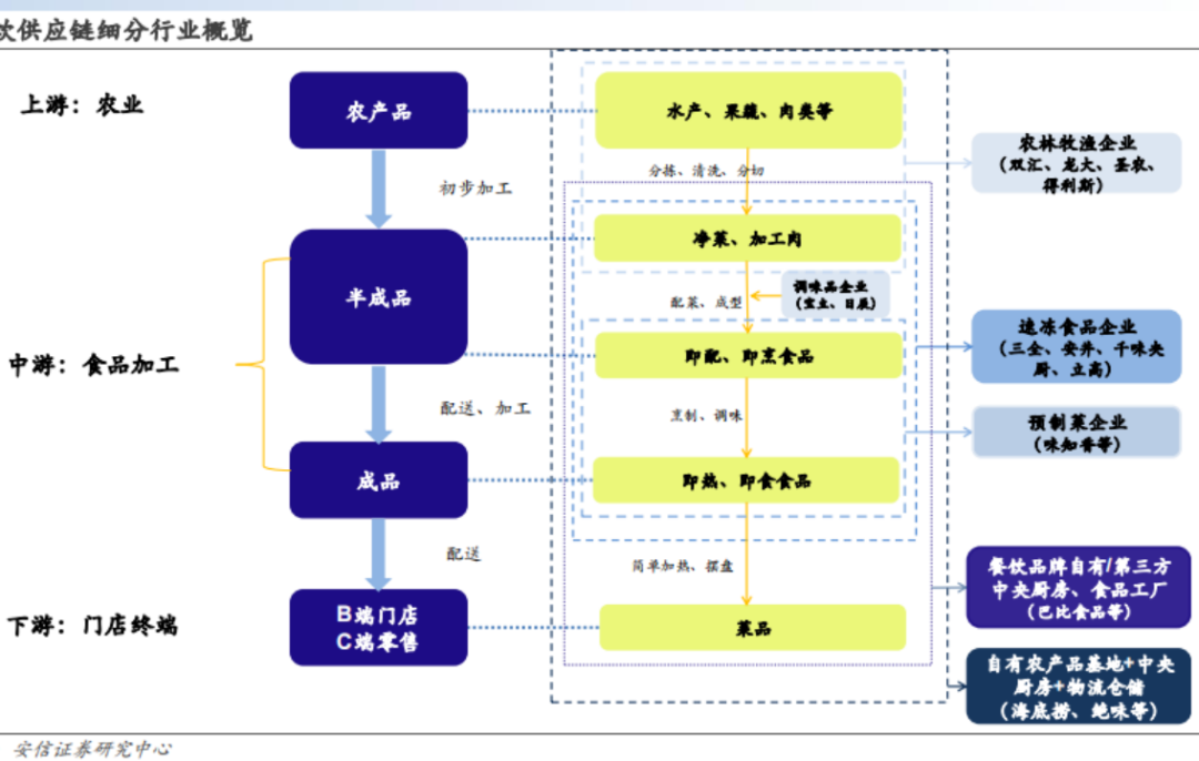 預(yù)制菜一般出現(xiàn)在中游環(huán)節(jié),像是安井、三全、千味央廚等,都就此布局。