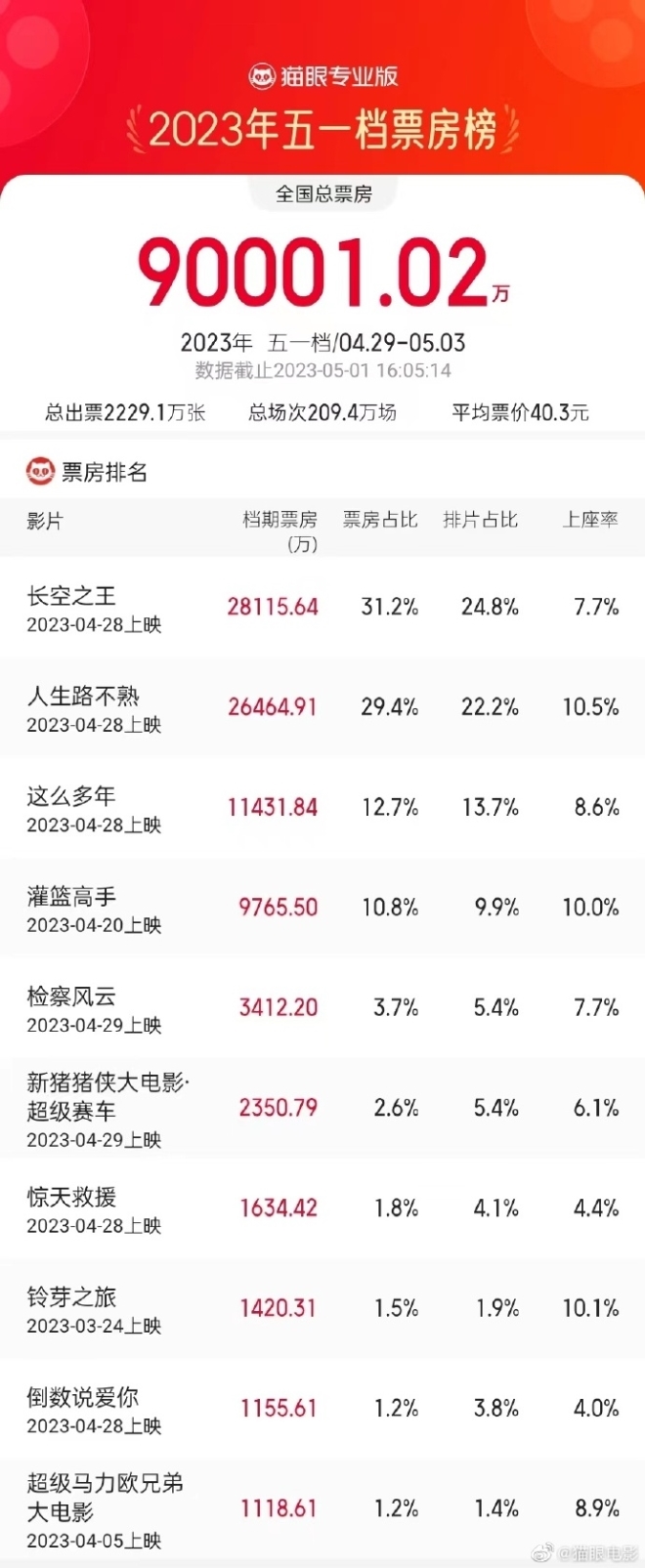 據(jù)貓眼專業(yè)版數(shù)據(jù)顯示,截至5月1日12時(shí),2023五一檔期總票房破9億。
