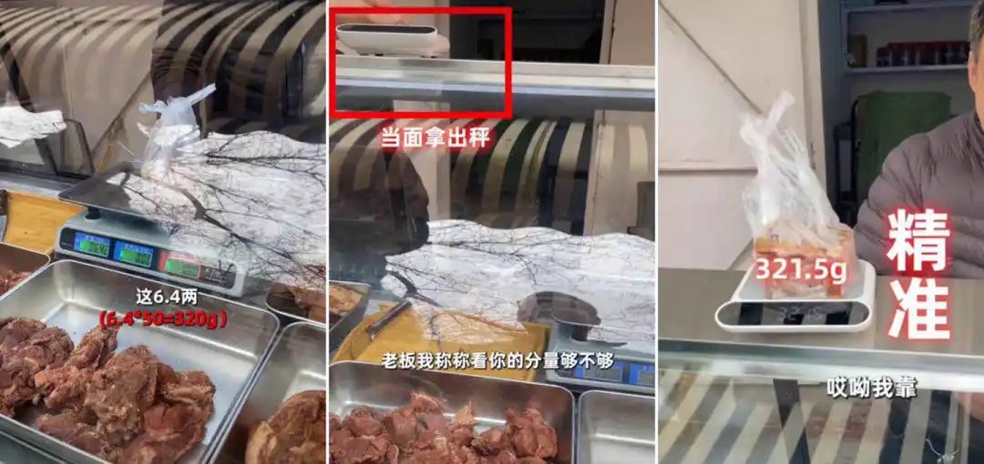 在淄博必打卡網(wǎng)紅菜市場八大局中,B太和他的電子秤先盯上了一家鹵肉店(缺斤短兩的“重災區(qū)”)。10塊錢一斤的鹵肉,老板稱重6.4兩,B太在老板稱重后當面拿出電子稱測量,結(jié)果令人驚嘆,“老板竟然還往少了稱”。