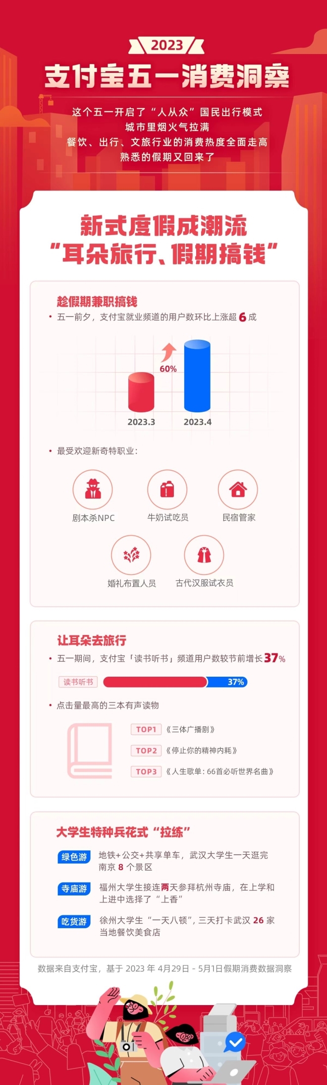 此外,當(dāng)假日消費(fèi)如火如荼的同時(shí),假期靈活用工的需求也隨之?dāng)U大。趁著假期兼職搞錢,正在成為這屆年輕人過五一的流行趨勢。支付寶平臺顯示,五一前夕,在支付寶就業(yè)頻道找工作的用戶數(shù)環(huán)比上漲超6成,劇本殺NPC、牛奶試吃員、民宿管家、婚禮布置人員、古代漢服試衣成為今年五一最受歡迎新奇特職業(yè)。