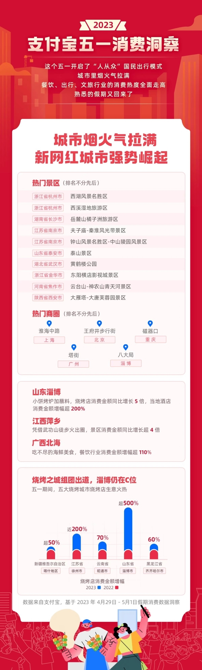 不過除了老牌的旅游目的地,探索特色潮流小城正成為旅游新趨勢。一系列二三線城市也抓住五一消費(fèi)高峰,推出城市特色旅游名片,各顯其能招待外地游客。燒烤絕對是今年五一最熱美食關(guān)鍵詞,淄博的旅游熱度從五一前就一路走高,支付寶統(tǒng)計(jì)數(shù)據(jù)顯示,消費(fèi)者在淄博燒烤店消費(fèi)金額暴漲超5倍,帶動酒店消費(fèi)金額增幅也超2倍。鑒于淄博接待力飽和,各地紛紛花式拉游客,新疆、江蘇、東北、云南等各地?zé)径季砹似饋,江蘇徐州燒烤緊隨淄博之后消費(fèi)金額增長近2倍。
