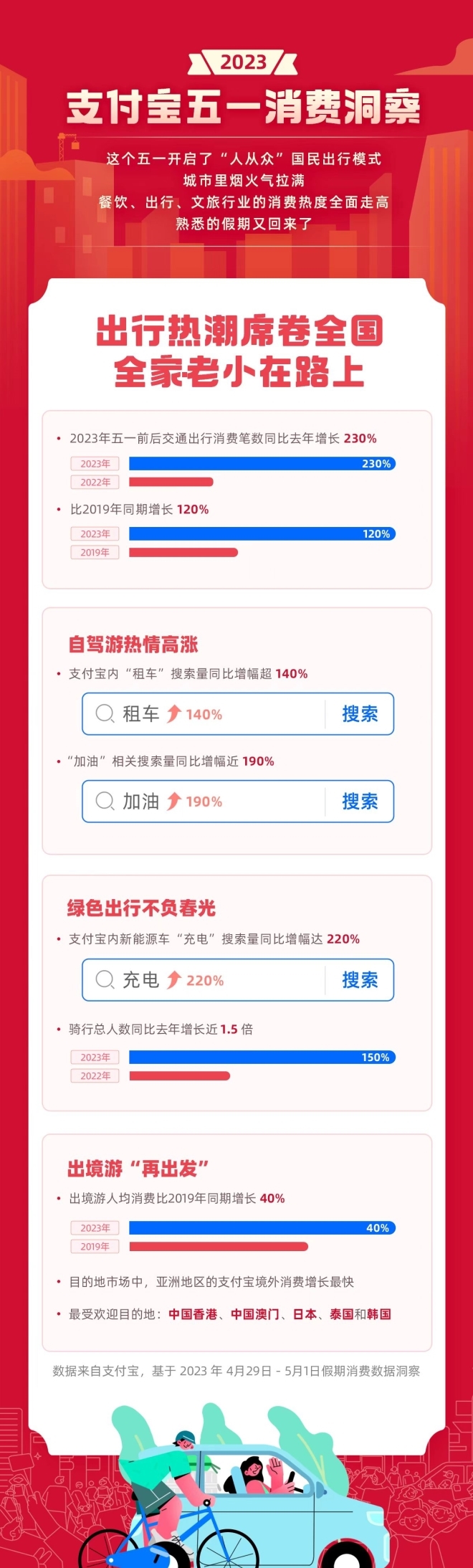 今年五一,全國開啟了“人從眾”國民出行模式,動起來絕對是主旋律。支付寶綜合數(shù)據(jù)顯示,小長假前3天里使用支付寶交通出行的支付筆數(shù)同比去年增長230%,且達(dá)到2019年的2.2倍。在支付寶找“租車”自駕出游、找“充電”服務(wù)分別是2022年同期的2.4倍和3倍。今年騎單車賞景,在路上揮汗如雨的游客比去年同期也增長了1.5倍,其中上海人對騎行的喜愛在全國居首。