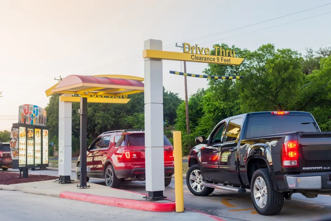 汽車(chē)穿梭餐廳的外圍設(shè)有一條長(zhǎng)約100米左右的專(zhuān)用車(chē)道,最少可以容納6~7輛汽車(chē)排隊(duì)購(gòu)餐。車(chē)主無(wú)需下車(chē),只要搖下車(chē)窗,就可以買(mǎi)到食品,省時(shí)省力。據(jù)了解,美國(guó)快餐業(yè)內(nèi)的營(yíng)業(yè)額中有超過(guò)一半的收入來(lái)自汽車(chē)穿梭餐廳。2021年第一季度,麥當(dāng)勞美國(guó)市場(chǎng)的Drive-thru銷(xiāo)售額就占到了70%。