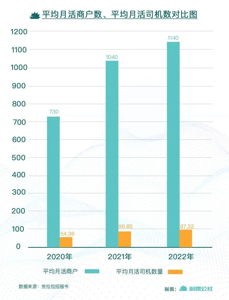 從全球市場(chǎng)來看,招股書顯示2020年、2021年、2022年貨拉拉平均月活商戶數(shù)分別為730萬、1040萬、1140萬,2021年和2022年分別同比增加30%、10%;平均月活司機(jī)數(shù)量分別為54.36萬、86.85萬、97.32萬,2021年和2022年分別同比增加37%、12%。