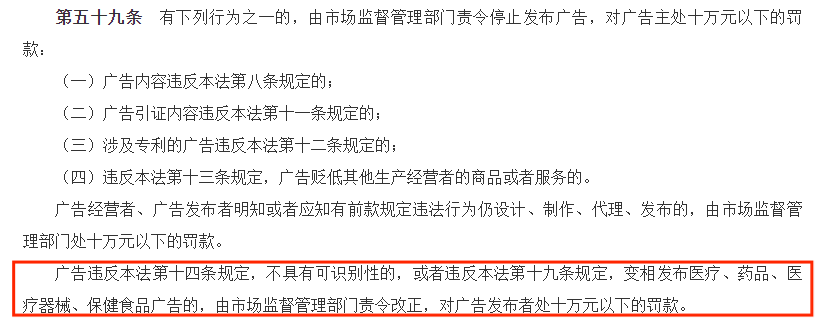 在《互聯(lián)網(wǎng)廣告管理辦法》將商業(yè)性質(zhì)的“種草”納入廣告范疇以后,其也需要受到廣告法的監(jiān)管。對于違規(guī)行為,《辦法》也給出了處罰標(biāo)準(zhǔn):互聯(lián)網(wǎng)廣告不具有可識別性的,依照廣告法第五十九條第三款規(guī)定予以處罰。