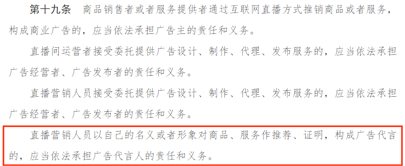 最為關(guān)鍵的是,“直播營銷人員以自己的名義或者形象對商品、服務(wù)作推薦、證明,構(gòu)成廣告代言的,應(yīng)當(dāng)依法承擔(dān)廣告代言人的責(zé)任和義務(wù)”。