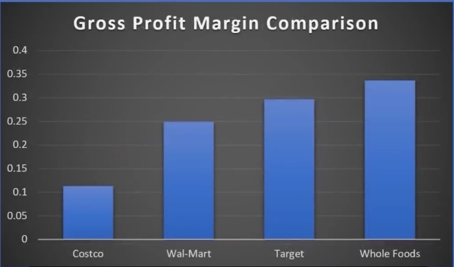 但是現(xiàn)在當(dāng)我們和其他商店比較時(shí),它一點(diǎn)也不高,它非常低,他們最終達(dá)到的高度是沃爾瑪的一半,全食的三分之一。關(guān)鍵是,其他地方賣東西給你就能賺錢,而開(kāi)市客真的賺不到。