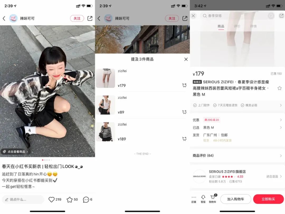 根據(jù)已有的案例,達人“辣味可可”發(fā)布的穿搭圖文筆記中,在筆記左下角會有“點擊查看商品”提示。用戶可以點擊查看達人穿搭筆記同款商品,直接跳轉(zhuǎn)購買商品。值得注意的是,筆記所關(guān)聯(lián)的是小紅書站內(nèi)店鋪,而非外部電商平臺。