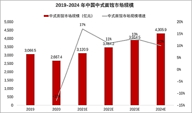 2021年初中國中式面館總量約為110萬家,大部分以快餐業(yè)態(tài)為主,相比其他中餐售價,總體消費(fèi)價格偏低,其價格隨區(qū)域和地段波動明顯。2020年受全球疫情影響,中式面館市場規(guī)模整體降低,2021年后隨著疫情常態(tài)化發(fā)展,餐飲行業(yè)恢復(fù)運(yùn)營,中式面館市場迅速恢復(fù)增長并保持相對穩(wěn)定的增長速率。2021年全國中式面館市場規(guī)模約為3,100億元,預(yù)計2024年市場規(guī)模將突破4,300億元,在消費(fèi)升級和產(chǎn)品多元化的雙重帶動下,行業(yè)將維持快速發(fā)展的勢頭。