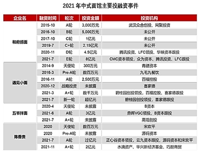 2021年,中式面館融資事件總數(shù)僅次于茶飲和咖啡兩大行業(yè)。中式面館成為了餐飲資本的新寵,和府撈面、遇見小面、五爺拌面以及陳香貴等多家連鎖面館品牌獲得投資青睞。