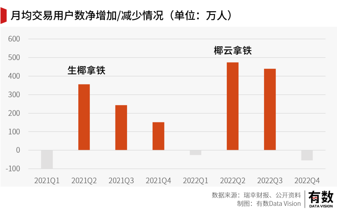 而這就是瑞幸不斷推出爆款所帶來的增量。以生椰拿鐵、生酪拿鐵為代表,瑞幸的新品幾乎以一季度一爆款的速度不斷接力,同時(shí)每一次爆款的推出都能為瑞幸?guī)硇掠脩,體現(xiàn)在數(shù)據(jù)上,則是爆款推出后,數(shù)個(gè)季度的連續(xù)月均交易用戶數(shù)凈增長。