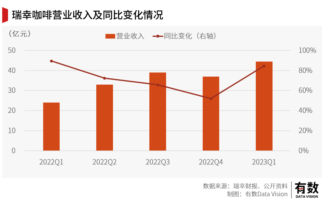 從收入端來看,2023年一季度,瑞幸總營收44.4億元,同比增長84.5%,依舊維持了此前數(shù)個(gè)季度的高速增長態(tài)勢。