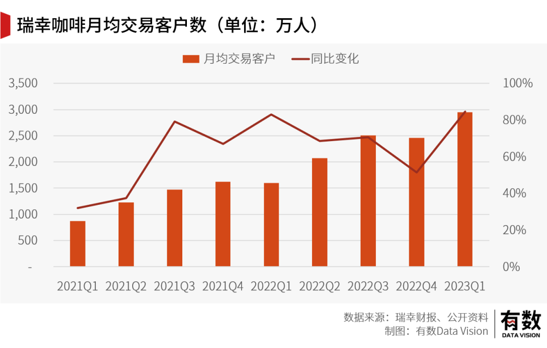 但瑞幸似乎并沒有遇到這個(gè)問題,今年一季度,瑞幸月均交易客戶數(shù)達(dá)到2949萬人,同比增長85%,而將這一指標(biāo)平均到每家門店上,則是單店月均交易客戶數(shù)為3154人,同比增長30%。