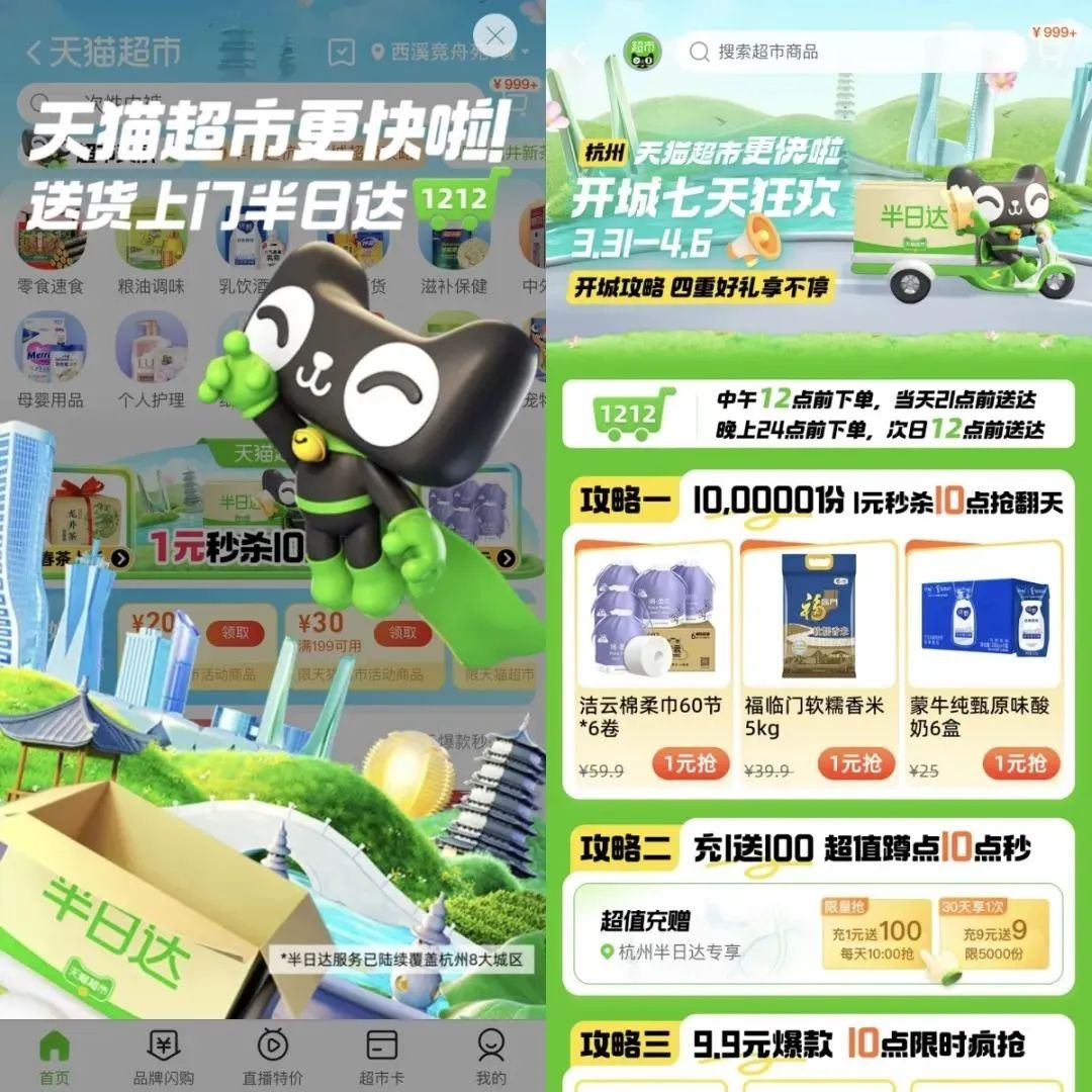 今年3月底,天貓超市宣布在杭州啟動半日達服務(wù)。消費者在天貓超市下單后,僅需半天時間就能收到商品。