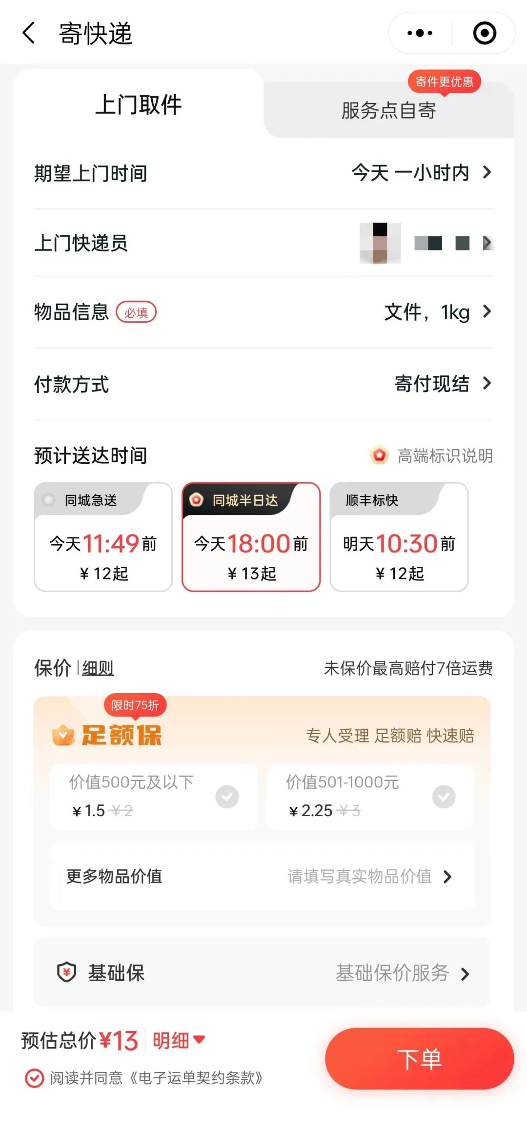消費者在順豐App或小程序下單寄件時,如果收寄件地址在相同城市,就會自動出現(xiàn)“同城半日達”選項,下單后一小時內(nèi)會有順豐小哥上門取件。