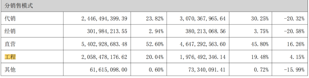 工程渠道即與房企產(chǎn)企業(yè)進(jìn)行合作,根據(jù)歷年財(cái)報(bào),老板電器的工程渠道收入占比從2016年的6%左右提升至2020年的23%,但在2021年,工程渠道收入占比降至19.48%,根據(jù)2022年財(cái)報(bào),工程渠道收入為20.58億元,占總營(yíng)收的比例為20.04%,與2021年相比差別不大。