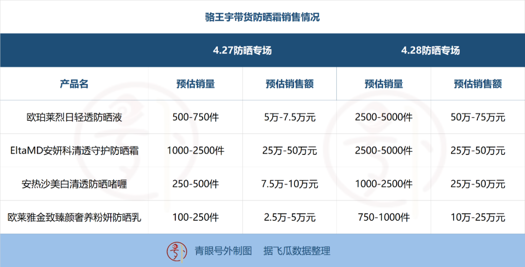 據(jù)飛瓜數(shù)據(jù)顯示,駱王宇曾于4月27日和4月28日開啟了兩次防曬專場的直播帶貨,帶貨的防曬霜產品包括歐珀萊烈日輕透防曬液、EltaMD小白盾、安熱沙小光管和歐萊雅金致臻顏奢養(yǎng)粉妍防曬乳四款產品,在整體銷售情況更好的4.28防曬專場中,歐珀萊烈日輕透防曬液預估銷售額達50萬-75萬元,EltaMD小白盾和安熱沙小光管的預估銷售額也都達到了25萬-50萬元。