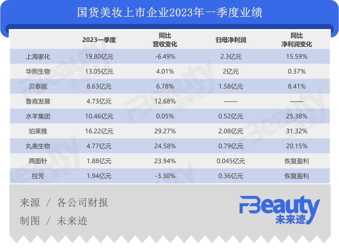 但在2023年第一季度,大部分國(guó)美妝企業(yè)還是迎來(lái)了開門紅,大部分國(guó)貨美妝上市企業(yè)都實(shí)現(xiàn)了營(yíng)收的增長(zhǎng),其中珀萊雅、丸美生物、魯商發(fā)展依舊保持雙位數(shù)的增長(zhǎng)。魯商發(fā)展旗下品牌頤蓮2023年1季度現(xiàn)收入1.71億元,璦爾博士實(shí)現(xiàn)營(yíng)收2.43 億元。