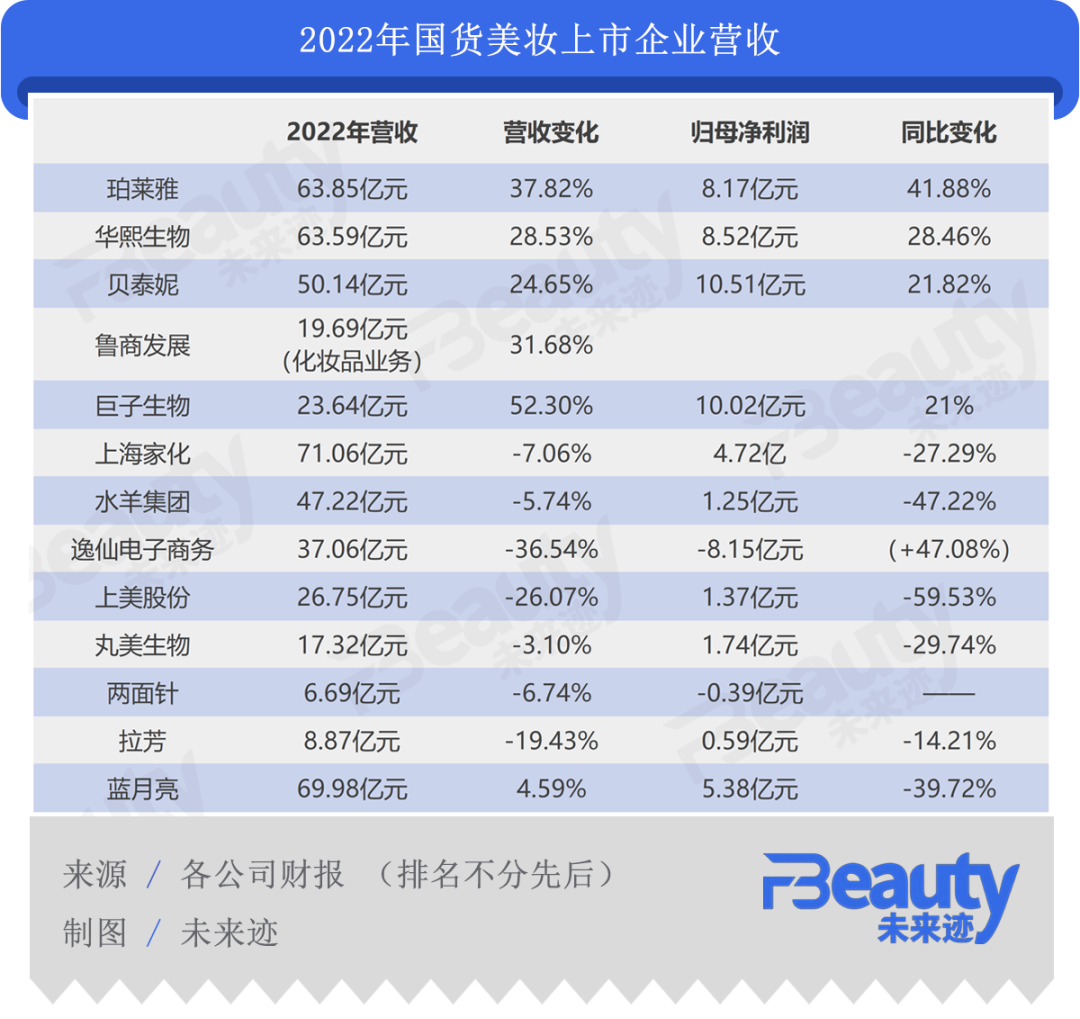 在疫情的大環(huán)境下,國(guó)貨美妝企業(yè)依舊保持著極強(qiáng)的韌性,除了處于轉(zhuǎn)型期的上美股份和逸仙電商之外,大部分國(guó)貨美妝企業(yè)的營(yíng)收波動(dòng)均在正常范圍之內(nèi),而珀萊雅、華熙生物、貝泰妮、巨子生物等主打功效護(hù)膚的企業(yè)在2022年依舊保持強(qiáng)勁的增速,企業(yè)營(yíng)收增長(zhǎng)均超過(guò)了20%。