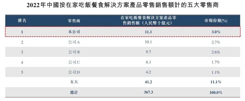 《招股書(shū)》顯示,2022年,中國(guó)按在家吃飯餐食解決方案產(chǎn)品零售銷(xiāo)售額計(jì),排名第一的為鍋圈,市場(chǎng)份額為3%。不過(guò)不能忽視的是,相較于整體的餐飲行業(yè),中國(guó)在家吃飯市場(chǎng)的整體大盤(pán)并不高。