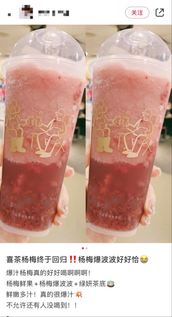 今年喜茶還抓住楊梅鮮果“爆”的果肉特色,在此基礎(chǔ)上進(jìn)行創(chuàng)新研發(fā),加入定制小料“楊梅爆波波”,與楊梅果肉一起帶來雙重爆感!氨úǖ目诟刑昧恕、“楊梅和爆波波這對(duì)CP我鎖死了”……今年喜茶楊梅產(chǎn)品上新后,這款全新定制小料獲得了消費(fèi)者的點(diǎn)贊好評(píng)。