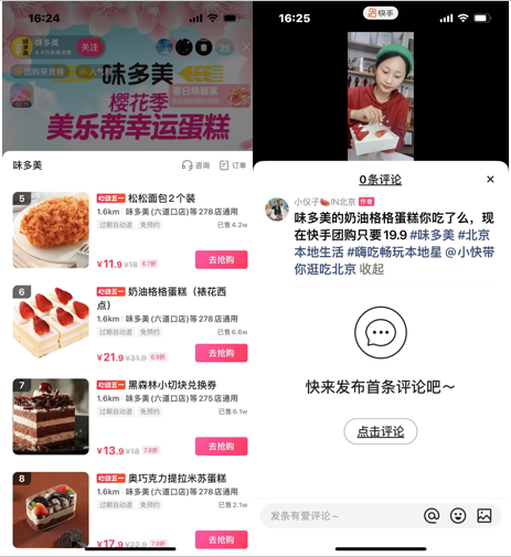 去年9月,快手也宣布將本地生活服務(wù)升級為一級部門,和主站、商業(yè)化、電商、國際業(yè)務(wù)屬于同一層級。目前,快手的本地生活服務(wù)以團(tuán)購為主,相當(dāng)于在模仿抖音的老路。根據(jù)小可提供的消費(fèi)對比,抖音和快手上的產(chǎn)品價(jià)格基本差距不大。以味多美的奶油格格蛋糕為例,抖音直播的價(jià)格為21.9元,快手探店的價(jià)格為19.9元。