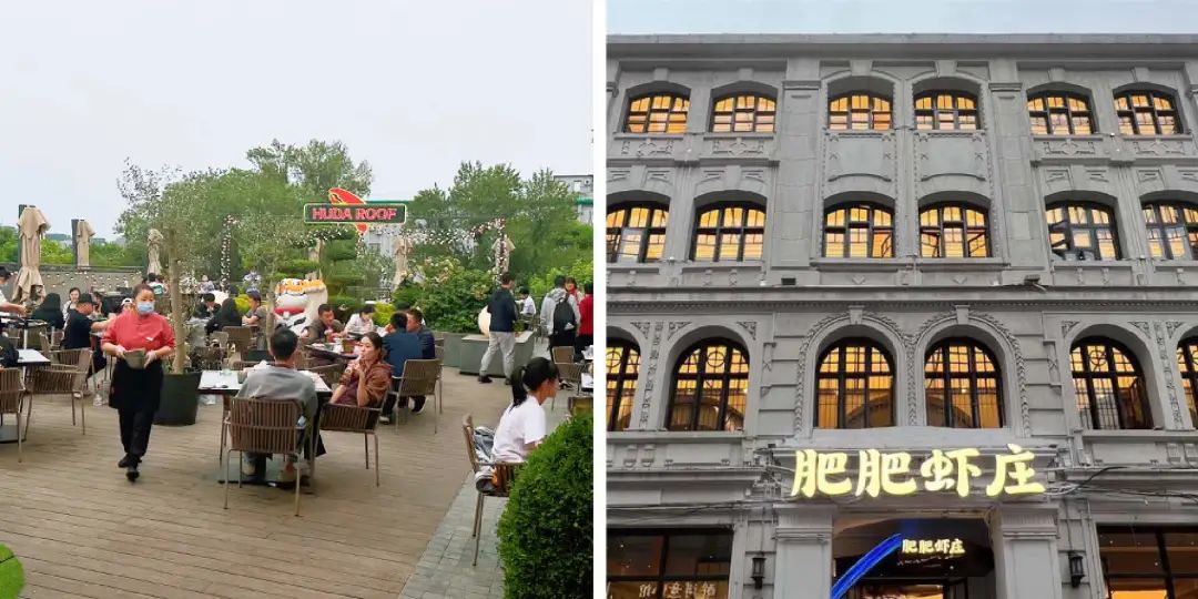 ◎左:胡大飯館露臺(tái),右:肥肥蝦莊