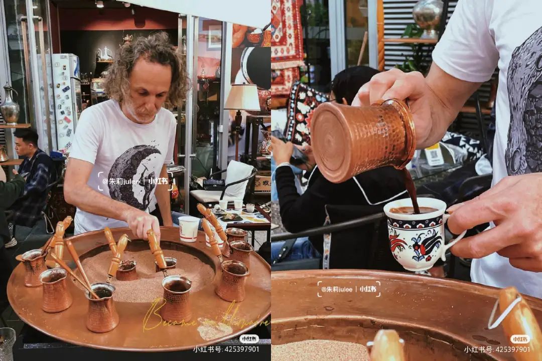 北京上海的咖啡市集上,已經(jīng)多次出現(xiàn)“土耳其咖啡”的面孔。店家用土耳其傳統(tǒng)方法,把咖啡粉和冷水一同置入土耳其壺,放在熱砂上轉(zhuǎn)圈加熱,給消費者呈現(xiàn)出一款異域風(fēng)情的咖啡。